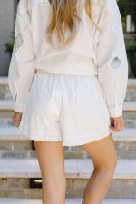 Embroidered seashell design on front of shorts